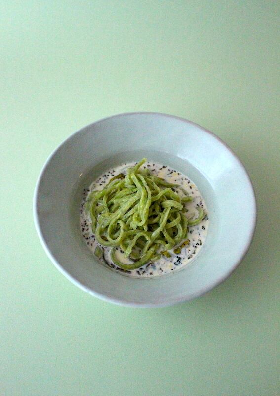 黄色のセモリナ粉に春菊の鮮やかな緑を合わせ、